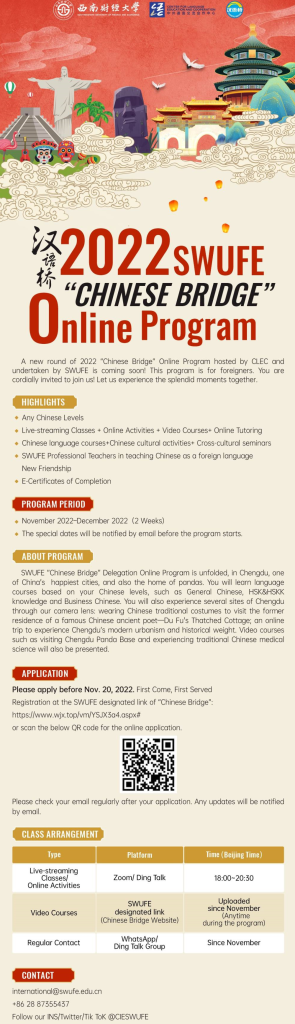 Até o dia 20 de novembro, a Southwestern University of Finance and Economics (SWUFE), receberá inscrições para o programa on-line e gratuito “Chinese Bridge”, direcionado para estudantes da América Latina. As inscrições podem ser realizadas neste formulário ou pelo QR code disponível no folheto.