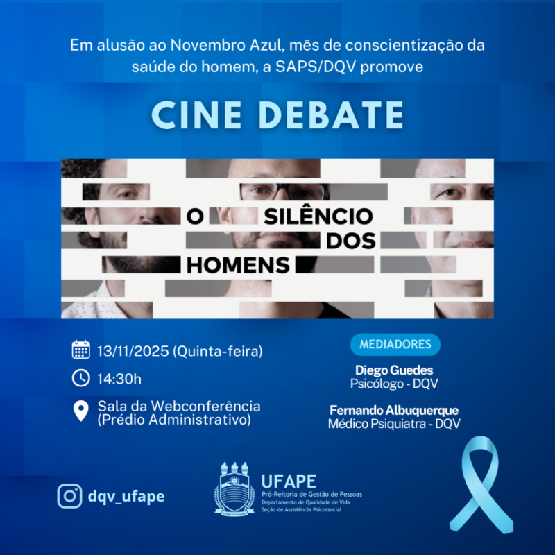 Em alusão ao Novembro Azul, mês de conscientização da saúde do homem, o Departamento de Qualidade de Vida, através da Seção de Assistência Psicossocial, convida toda comunidade acadêmica para participarem do nosso último CINEDEBATE deste ano, que será realizado no dia 13 de Novembro de 2025 (Quinta-feira), ás 14:30, na Sala da Webconferência (Prédio Administrativo), com a exibição do documentário O silêncio dos homens.